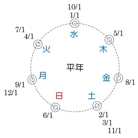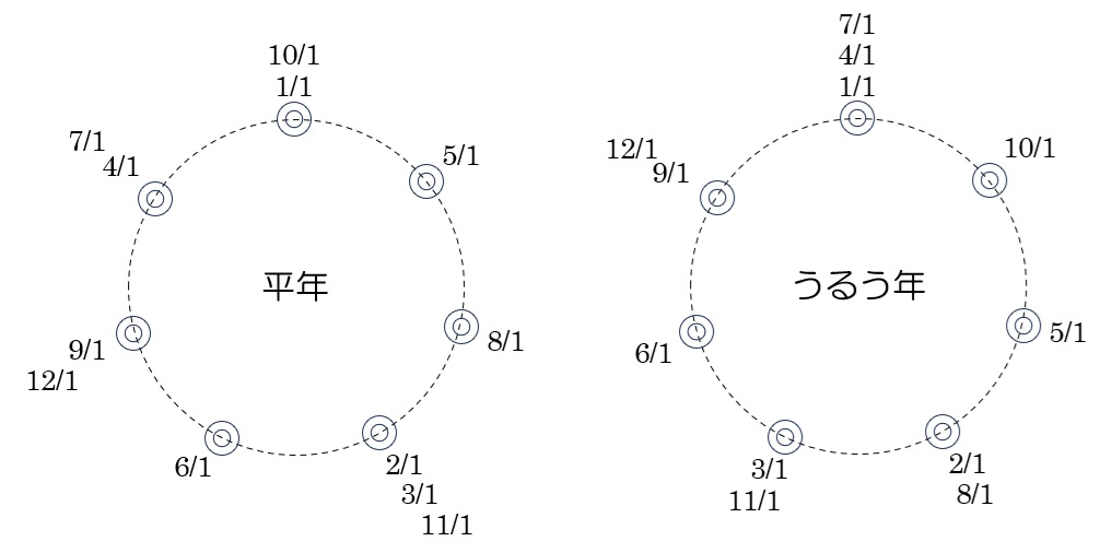 上のぐるぐるカレンダーの左が平年の図なので、これを使いましょう。