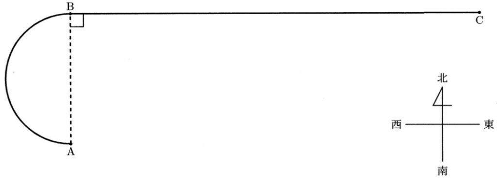 ある高層ビルの屋上には,図のような直径7mの遠州の半分と,長さ22mの直線を組み合わせた形の展望コースがあり,C地点はB地点の真東の方向にあります。身長180cmの父と身長120cmの子どもがこのコース上をA地点からC地点まで,それぞれ一定の速さで歩きます。ただし,A地点とB地点を結ぶ,図の点線は半円の直径です。円周率を\(\frac{22}{7}\)として,次の問いに答えなさい。