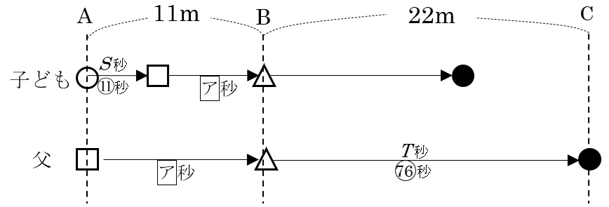 ⑴ ある日,子どもがA地点を出発し,父がそのS秒後にA地点を出発しました。父はB地点で子供を追いこし,さらにそのT秒後にC地点に到着しました。このとき,S:T=11:76でした。