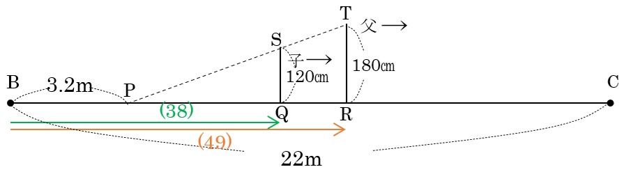 父がBC間を(76)秒で進んだので、AB間は(76)÷2=(38)秒で進んだ。⇦図のア
