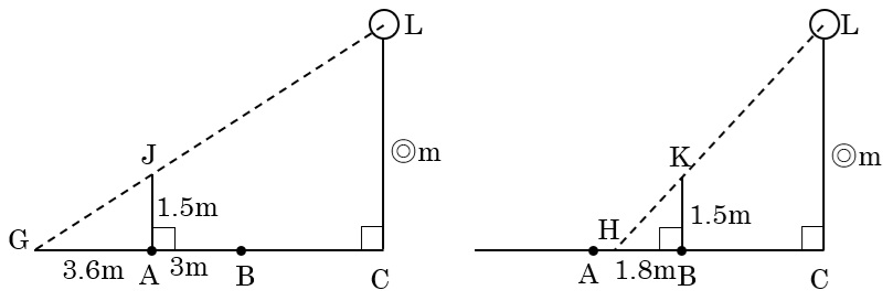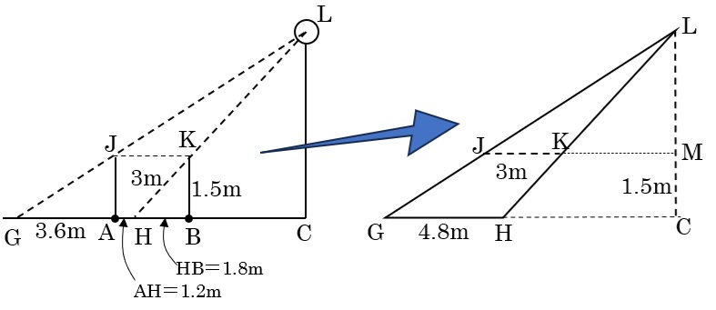 次に左の図で(右の図で考えてもいい)三角形LGCと三角形JGAはピラミッド相似で、相似比は3.6:(3.6+6)=3:8より、光源の高さLC(◎)=1.5×\(\frac{8}{3}\)=4m