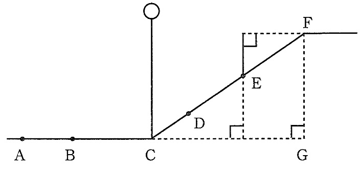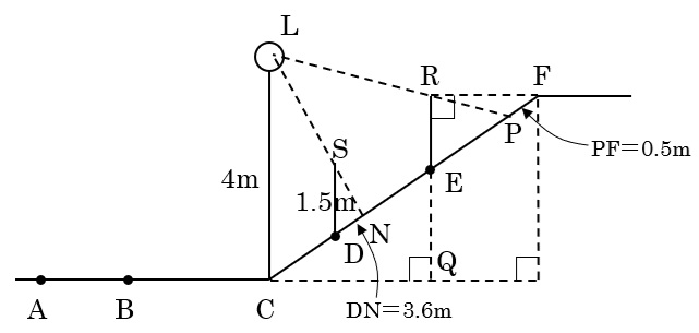 また,地点Cから地点Fまでは,傾きが一定の上り坂が続き,地点Cから地点Fの方向へ少し上った地点Dでは,影の長さは3.6mでした。さらに地点DからCD間の距離の1.5倍の距離を地点Fの方向へ上った地点Eでは,棒の上端と地点Fが同じ高さとなり,そのときの棒の影の先端は,地点Fから地点Eの方向へ0.5m離れた地点にありました。このとき,次の問いに答えなさい。