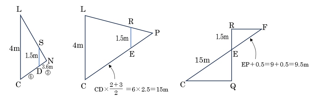 ER=1.5mだから、求める高さは1.5×\(\frac{15+9.5}{9.5}\)=\(\frac{147}{38}\)m