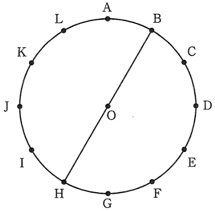 右の図のように点Oを中心とする円と,その円周を12等分した点AからLまでがあります。点Pと直線ℓは赤と青の2種類のスイッチと連動して動くものとします。