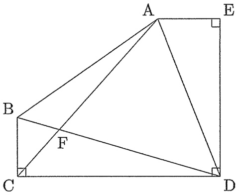 下の図のような五角形ABCDEがあります。角C,角D,角Eはすべて直角で,辺BC,辺DEの長さはそれぞれ10.5cm,33cmです。ACとBDの交点をFとするとき,三角形BCF,三角形AFDの面積はそれぞれ27cm2,432cm2です。このとき次の問いに答えなさい。