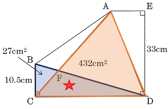 面積が分かっている2つの三角形にそれぞれ三角形FCD(★)を付け加えて考える。(付け足し「差」の考え方)