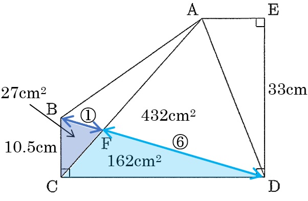CD=36cmと分かったので、三角形BCD=10.5×36÷2=189cm2より、三角形FCD=189-27=162cm2